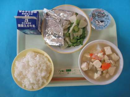 12月13日の給食は、ごはん、牛乳、さばのぎんがみやき、かぶのいろどり、うちまめじる、ヨーグルトです。うちまめじるには、とうふや大豆がたくさん入っており、タンパク質をたっぷりとることができました。