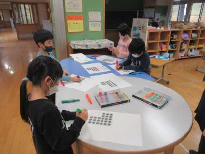 2年生では、学習したかけ算を生かして、いろいろな並び方の計算に取り組んでいました。どのように分けるか、プリントに区切りを書いていました。友達と比べ、いろいろな方法があることに気づいていました。