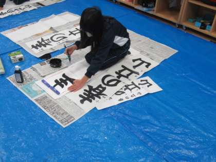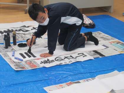 4年生はだるま筆を使って、力強く「春の立山」を練習していました。太い筆ですが、だんだん扱いが上達しています。