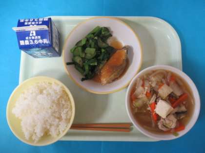 今日の給食は、ごはん、牛乳、ふくらぎのみぞれがけ、とろろこんぶあえ、はくさいなべです。今日は、きときとランチです。富山の食材が使われており、おいしい富山を味わいました。