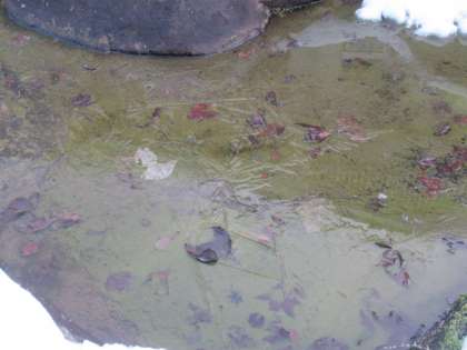 昨日までの雪はやみましたが、ぬれた地面は凍っていました。ビオトープの池にも氷がはっていました。