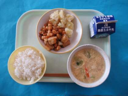 今日の給食は、ごはん、牛乳、さかなとだいずのねぎソースからめ、こふきいも、かきたまじるです。だいずはからっとあげてあり、かみごたえがありました。ねぎソースがとてもよくしみていておいしかったです。