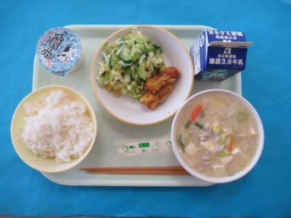 3学期最初の給食です。ごはん、牛乳、ちくわのカレーあげ、あわせあえ、とうにゅうじる、ヨーグルトです。1月は給食週間があります。食事の大切さ、作ってくださる方への感謝をわすれずにいただきたいと思います。