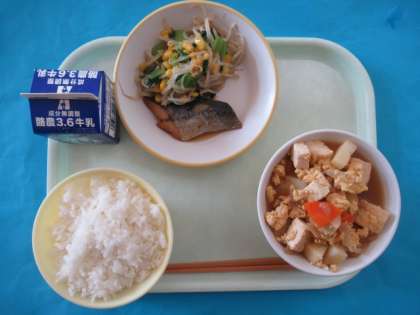 今日の給食は、ごはん、ぎゅうにゅう、さわらのさいきょうやき、コーンあえ、あつあげのにしきとじです。コーンあえでは、もやし、チンゲンサイの野菜があり、歯ごたえよく食べることが出来ました。