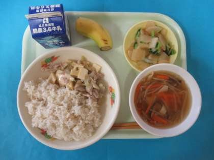今日の給食は、むぎごはん、ぎゅうにゅう、しおだれぶたどん、かぶのいろどり、わんたんスープ、バナナです。子供たちの大好きなどんぶりもの、おかわりをたくさんしました。