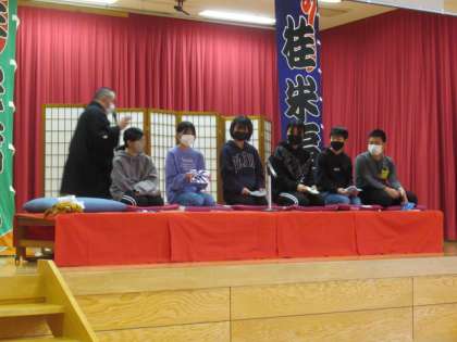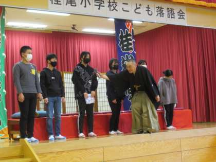 次に、子供たちが、小話に挑戦しました。短い話でしたが、米福師匠に上手だとほめていただきました。もしかしたら、未来の落語家が生まれるかも・・・