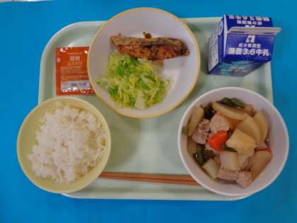 今日の給食は、ごはん、さかなのえごまだれ、ゆでキャベツ、だいこんとぶたにくのにこみ、こくもつふりかけです。だいこんとぶたにくのにこみは、具材に味がしみていておいしかったです。
