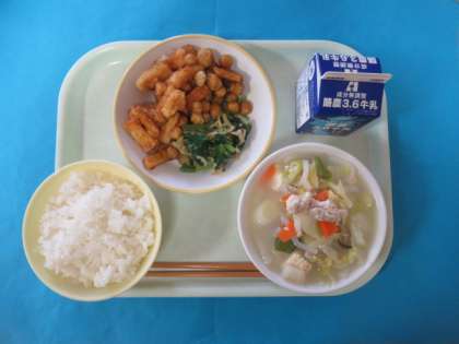 1月24日の給食は、ごはん、ぎゅうにゅう、そこなしイ〜カビーンズ、にんじゃジンジャーのおひたし、しおこうじなべです。イカはとてもは歯ごたえがあり、おいしくいただきました。