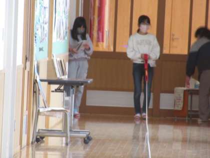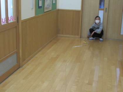 4年生の子供たちは、算数の時間、いろいろなものの長さを測っていました。職員室前から樫の子ホールまでの長い廊下を測っていた子供たちは、長さを予想していました。約59メートルもの長さがあり、校舎の大きさを実感していました。