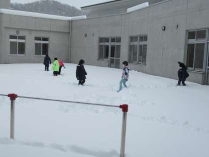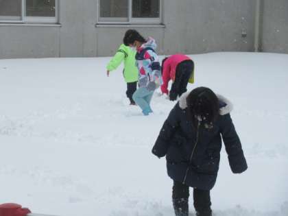 休み時間、ぐんぐん広場で雪遊びをする子供たちです。たくさんの雪にうれしそうです。