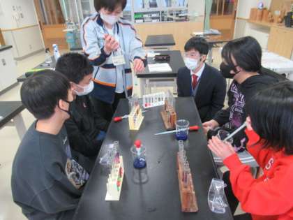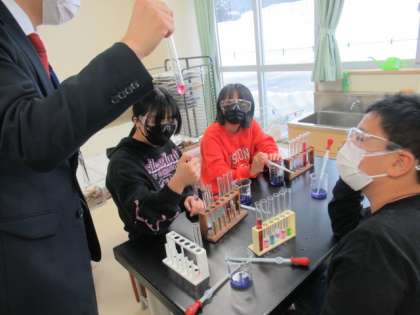 6年生の理科では、紫キャベツの煮汁を使って、酸、アルカリについて調べていました。紫色のしるが、緑、青、赤、ピンク色などに変わり、子供たちはそのきれいな色合いに驚いていました。リトマス紙以外でも、酸、アルカリを区別することができることを学びました。