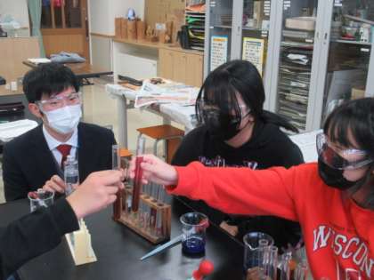 紫キャベツ 公開日 2023/01/30 更新日 2023/01/30 6年生 6年生の理科では、紫キャベツの煮汁を使って、酸、アルカリについて調べていました。紫色のしるが、緑、青、赤、ピンク色などに変わり、子供たちはそのきれいな色合いに驚いていました。リトマス紙以外でも、酸、アルカリを区別することができることを学びました。