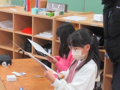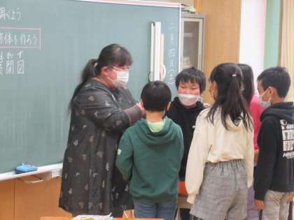 学習参観 3 公開日 2023/02/07 更新日 2023/02/07 5年生 4年生は、算数で直方体づくりをしました。直方体の面の形をよく見ながら作りました。展開図として広げると、いろいろな形ができており、子供たちはその形に驚いていました。