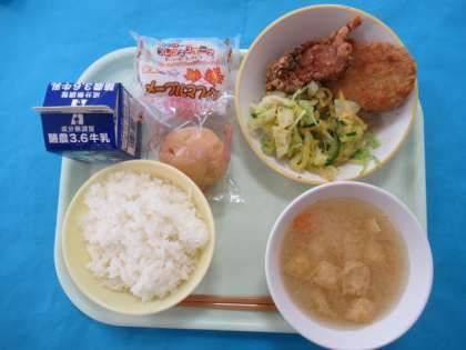 2月7日のメニューは、ごはん、ぎゅうにゅう、ぶたにくのたつたあげもしくはにくじゃがコロッケ、あわせみそしる、メープルマフィンもしくはいちごのシュークリームです。この日はセレクトこんだての日でした。子供たちは、自分の食べたいメニューを選び、とてもうれしそうにいただいていました。