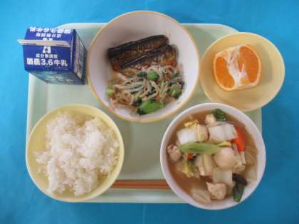 2月8日のメニューは、ごはん、ぎゅうにゅう、ちゃんこなべ、いわしのピリからに、いりだいずあえ、いよかんです。ちゃんこなべにはたくさんの具材があり、とてもおいしくいただきました。