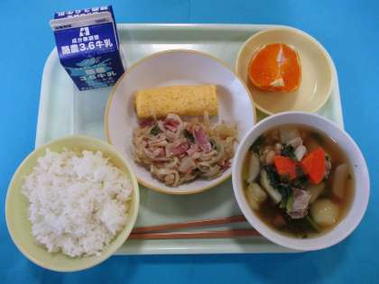 今日のメニューは、ごはん、ぎゅうにゅう、たまごロール、はりはりソテー、やさいのスープに、かんぺいです。やさいのスープには、いろいろな野菜が入っていて、やさしい味でした。今日は少し寒い日でしたが、給食を食べて元気いっぱいの樫尾っ子でした。