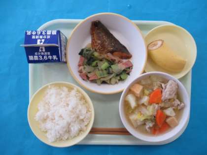 今日のメニューは、ごはん、ぎゅうにゅう、あじのみりんやき、チンゲンサイソテー、とんじる、バナナです。あじのみりんやきは、あまからく、ごはんにぴったりの味でした。