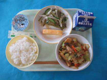 今日の給食は、ごはん、ぎゅうにゅう、あつやきたまご、くきわかめのすのもの、ホイコーロー、ヨーグルトです。すのものは、くきわかめとすのものがこりこりとした食感で、おいしくいただきました。