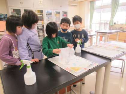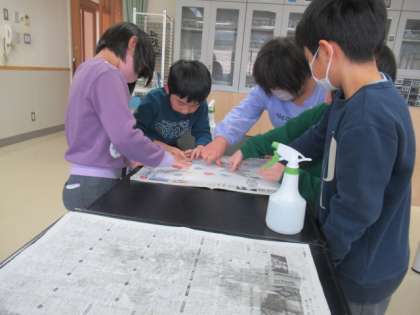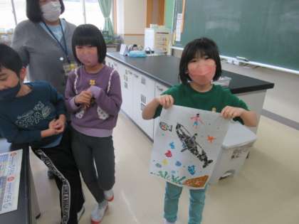 1・2年生では、これまで作ってきた紙版画の印刷を行いました。うまくできるか、ドキドキして紙をはがしていました。きれいに浮かび上がった作品に、大喜びでした。努力の成果を見ることができ、とてもうれしい瞬間です。