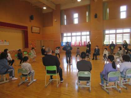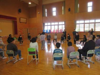 6年生が、お返しの出し物をしてくれました。全校みんなで、フルーツバスケットを行いました。