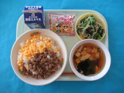 今日のメニューは、ごはん、そぼろどん(ぶたそぼろ、いりたまご)、なばなひたし、すましじる、ひなあられです。ひなまつりメニューで、とても彩り豊かでした。なばなひたしは、とてもきれいなグリーンで、春を感じさせてくれました。
