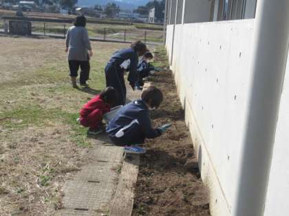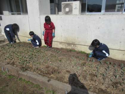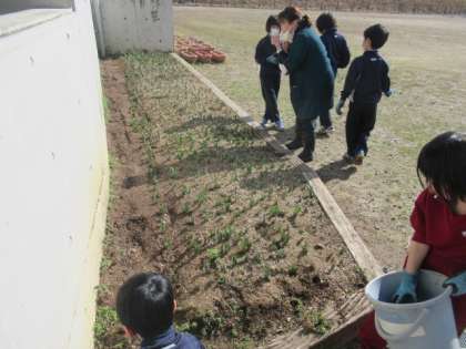 土寄せ 公開日 2023/03/07 更新日 2023/03/07 2年生 1・2年生は、芽が出てきたチューリップに土寄せをしたり、草むしりをしたりしました。芽を痛めないように、気をつけて取り組んでいました。