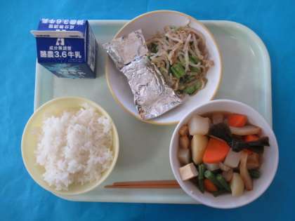 今日のメニューは、ごはん、ぎゅうにゅう、さばのぎんがみやき、ごまひたし、かんとうだきです。さばは、あまめのみそでホイル焼きされ、とてもおいしくいただきました。