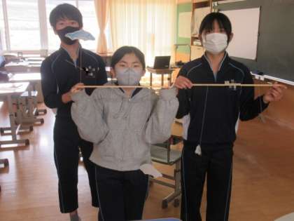 5年生は、理科「ふりこのきまり」の学習を生かしたおもちゃづくりを行いました。1つ目は、ふりこの長さのちがいを生かしたおもちゃです。すばやくゆらすと短いひものおもりが、ゆっくりゆらすと長いひものおもりがゆれます。この原理と関係があり、長周期地震でのビルのゆれ方を紹介した動画を見ました。