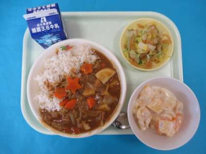 今日のメニューは、むぎごはん、ぎゅうにゅう、カレーライス、ふくじんあえ、フルーツヨーグルトです。カレーには、花形や星形のにんじんが入っており、調理員さんの愛情がこもっています。