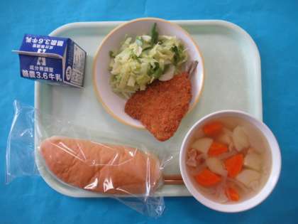今日のメニューは、コッペパン、ぎゅうにゅう、あじフライ、アスパラサラダ、ポテトスープです。あじフライはさくさく、アスパラサラダはこりこりと、食感も楽しみながらいただきました。