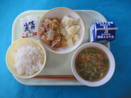 今日のメニューは、ごはん、ぎゅうにゅう、ぶたにくのキムチいため、こふきいも、ちゅうかかきたまじる、あじつけこざかなです。キムチいためは、食欲がますおいしさでした。