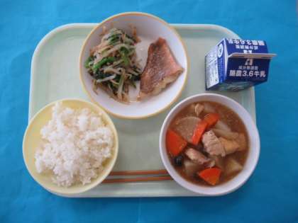 今日のメニューは、ごはん、ぎゅうにゅう、あかうおのしおやき、いりだいずあえ、とりにくとこんさいのごまにです。