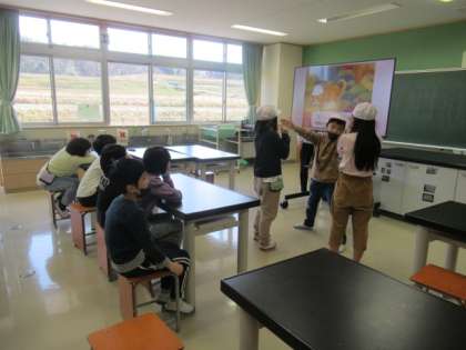 3年生が、1・2年生に英語のクイズ劇を発表しました。3年生は楽しそうに英語劇を行いました。