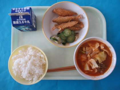 今日のメニューは、ごはん、ぎゅうにゅう、わかさぎのフリッター、こんにゃくサラダ、ボルシチです。ボルシチには、牛肉、トマト、タマネギ、ニンニク、ジャガイモなどたくさんの具材があり、おいしく煮込まれていました。
