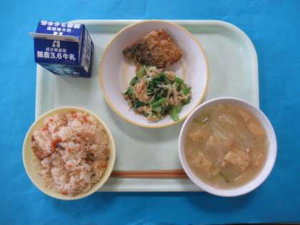 今日のメニューは、ごもくごはん、ぎゅうにゅう、さかなのかばやき、はりはりあえ、みそしるです。今日が今年度最後の給食です。一年間おいしい給食を食べ、子供たちは心も体も大きく成長しました。これからも、好き嫌いなく、いろいろなものを食べてほしいと思います。