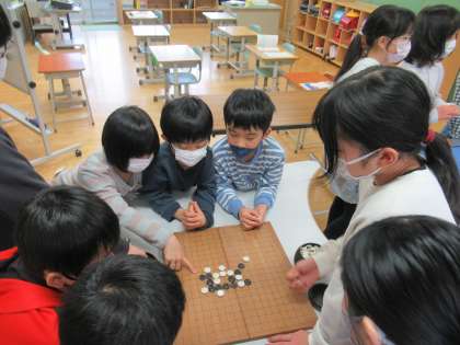 休み時間、ボードゲームや五目並べで盛り上がっていました。