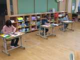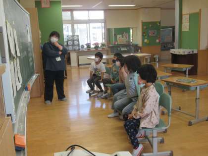1・2年生は、みんなで児童会のスローガンについて考えていました。どんな学校にしたいか、1・2年生もしっかりと考えを出し合っていました。