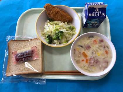 今日のメニューは、食パン、牛乳、サーモンフライ、ブロッコリーサラダ、クリームチャウダー、メープルジャムです。今日は、サミット給食のカナダの日です。給食の放送の時間には、カナダの特産物の紹介やクイズがあり、みんなでおいしく楽しくいただきました。