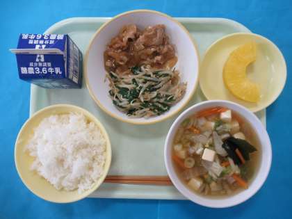今日の給食は、ごはん、ぎゅうにゅう、ぶたにくのしょうがやき、ナムル、ちゅうかスープ、パインアップルです。ナムルでは、もやしとにらの食感も楽しみました。