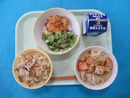 今日のメニューは、ふふふのごもくごはん、ぎゅうにゅう、しろえびのかきあげ、とろろこんぶ、おおかどそうめんじるです。今日は、サミット給食日本編です。富山県の食材を使った給食です。富山の食のすばらしさを体験しました。とてもおいしかったです。