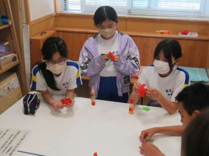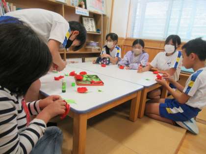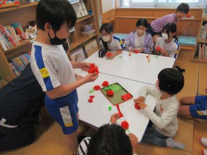 メディアルームでは、子供たちがカーネーション作りに取り組んでいました。心を込めて、花を開いていました。