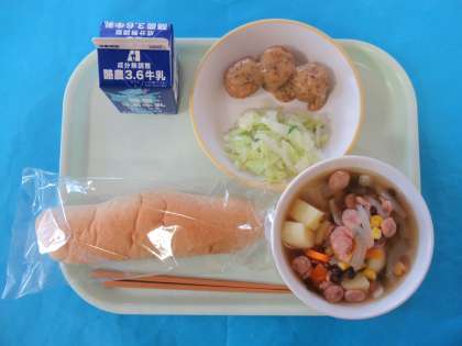 今日の給食は、ライむぎパン、ぎゅうにゅう、フリカデレ(ドイツふう一口ハンバーグ)、サワークラフト(キャベツのつけもの)、アイントプフ(ぐだくさんスープ)です。今日は、サミット給食 ドイツ編です。アイントプフには、レンズ豆がたくさん入っており、プチプチと食感も楽しみました。