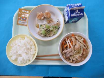 今日のメニューは、ごはん、ぎゅうにゅう、にんじんシューマイ、おひたし、かやくうどん、やさいふりかけです。シューマイの中のにんじんもおいしくいただきました。