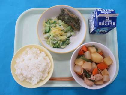 今日のメニューは、ごはん、ぎゅうにゅう、さかなのいそべあげ、あわせあえ、ちくぜんだきです。さかなのいそべあげは、あおのりの香りがしておいしかったです。