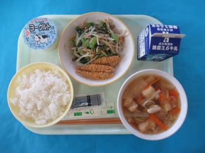 今日のメニューは、ごはん、ぎゅうにゅう、きびなごのさくさくあげ、いりだいずあえ、うすくずじる、のりつくだに、ヨーグルトです。きびなごは、からっとあがっていて、とてもおいしくいただきました。