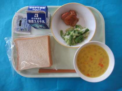 今日のメニューは、食パン、ぎゅうにゅう、てりやきチキン、イタリアンサラダ、かぼちゃポタージュ、ブルーベリージャムです。ポタージュでは、かぼちゃのあまさを十分感じながらいただきました。
