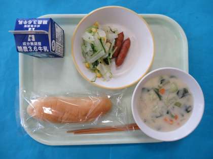 今日のメニューは、コッペパン、ぎゅうにゅう、あらびきウインナー、みずなのサラダ、クリームにです。クリームには、生クリームの風味を感じながらおいしくいただきました。