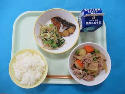 今日のメニューは、ごはん、ぎゅうにゅう、さばのしおやき、こうみあえ、ぶたにくのなんばんにです。さばのしおやきは、皮はぱりっと、身はしっとりとしており、とてもおいしかったです。