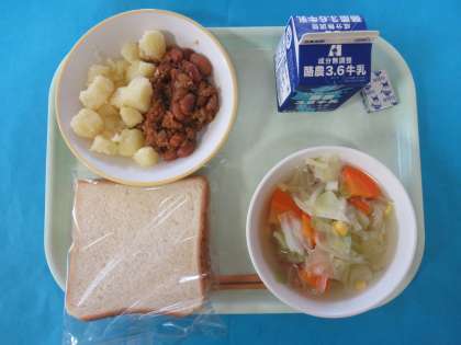 今日のメニューは、食パン、ぎゅうにゅう、チリコンカン、こふきいも、キャベツスープ、ポケットチーズです。キャベツスープには、キャベツを中心にたっぷりの野菜が入っており、野菜のうまみを味わいました。