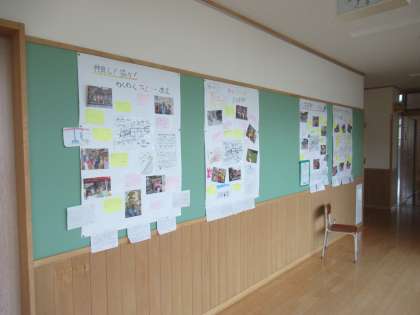 ファミリー遠足の新聞が掲示されています。楽しかった思い出がまとめてあります。